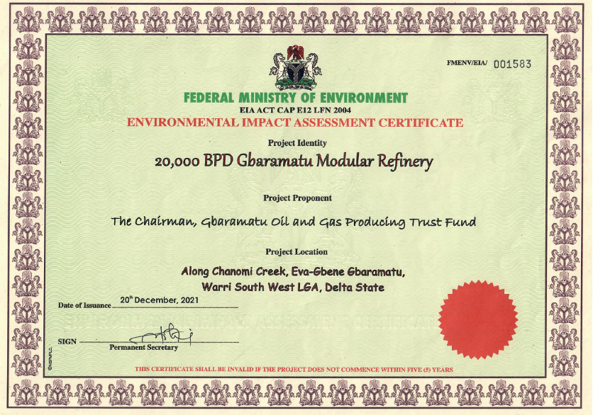 Environmental and Social Impact Assessment (ESIA) completed and Granted by the Federal Ministry of environment for the refinery and all utilities and supporting infrastructures (including Power Plant).