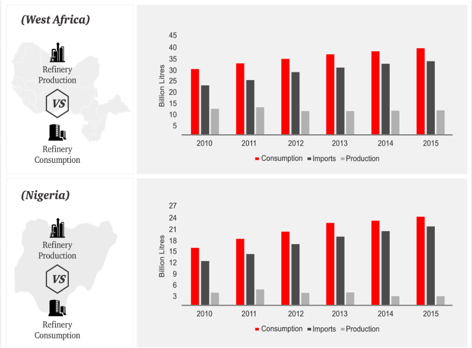 Total Annual Refinery Production and Markets Consumption in West Africa and Nigeria (Billions of Liters), Source Opec/US Energy Information Administration